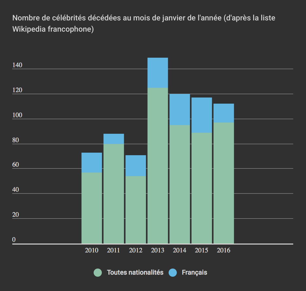 David Bowie, l’acteur Alan Rickman, l’écrivain Michel Tournier, le réalisateur Ettore Scola… En ce début 2016, de nombreuses célébrités semblent mourir les unes après les autres. Est-ce pour autant qu’il y en plus que les années précédentes ? C’est ce que Rue89 s’est demandé et ils ont cherché la réponse en consultant les données publiées par Wikipedia. Voici ce que cela donne : en 2013, il y avait plus de morts (plus de 140) qu’en janvier 2016 (moins de 120) à ce jour. Rassuré(e) ?