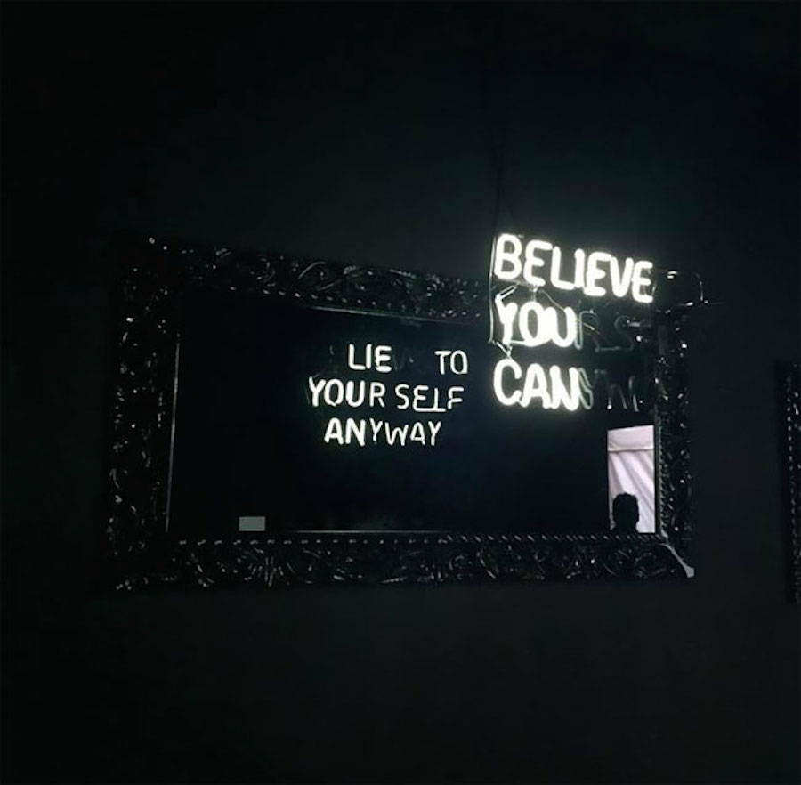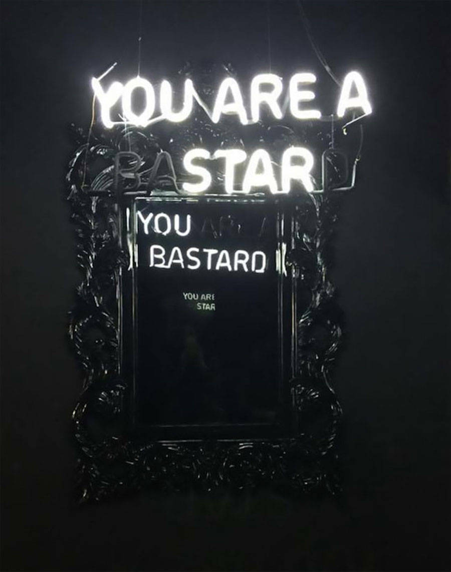 En utilisant des miroirs et des néons, l’artiste colombien Camilo Matiz confère un double sens à ses œuvres. Les messages légers initialement formulés prennent une signification vraiment différente à travers leur réflexion dans le miroir, nous offrant une version plus réaliste et moins optimiste de celle du début. « Vous êtes une étoile » devient alors « Vous être un bâtard », « Prendre un selfie » devient « inventer une vie » et ainsi de suite. Un travail intéressant de réflexion et de mise en scène, en noir et blanc, intitulé « Here Not There » qui nous interroge sur la dualité de l’être humain.
