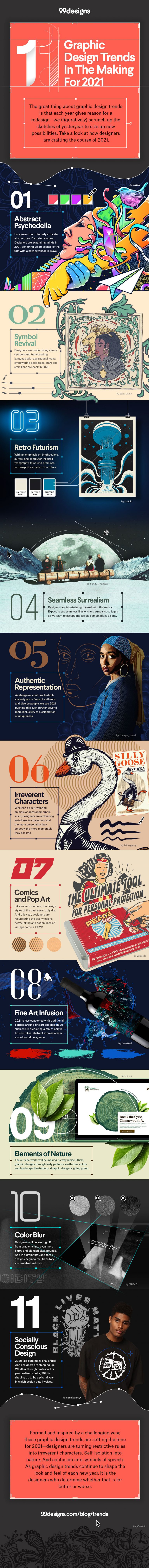 Remplie d’idées et d’inspirations pour les graphistes et designers, l’infographie de l’agence 99designs révèle 11 tendances pour 2021, avec une explication pratique de chacune. Une année à venir qui sera dominée par des styles plus audacieux et plus surréalistes !