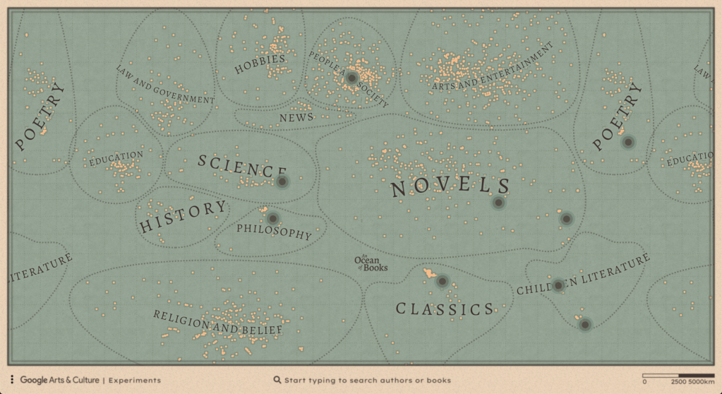 La nouvelle expérience baptisée « An Ocean of Books » nous invite à naviguer et à parcourir différents points d’une carte du monde sur le modèle de Google Earth, dans laquelle chaque île représente un auteur ou une autrice et chaque ville représente un livre. À ce jour, cette initiative propose une sélection de 113 008 auteurs/autrices et 145 162 livres, répartis sur différents « continents », qui correspondent à différents genres littéraires : les classiques, la religion & les croyances, l’histoire, la science, la poésie, l’art & le divertissement, la philosophie, l’éducation, le roman, la société ou encore la littérature jeunesse.