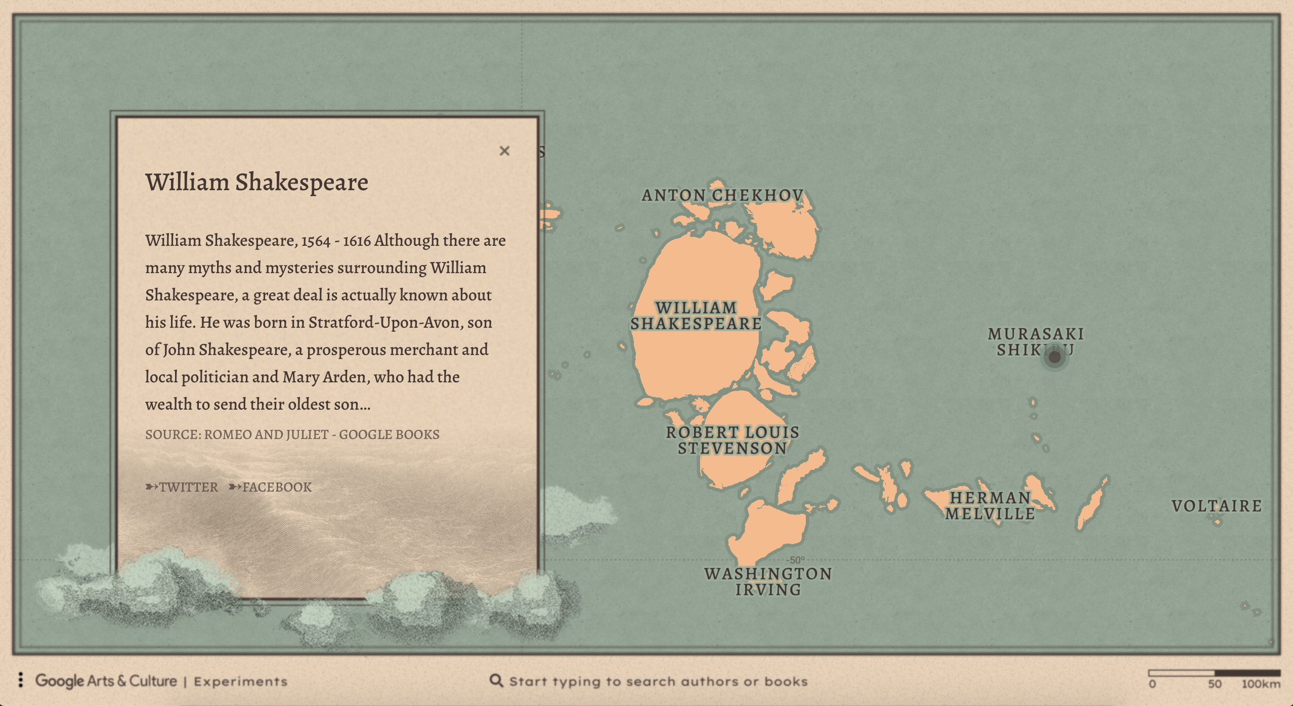 Ce qui est intéressant dans cette carte c’est qu’une fois que vous avez trouvez l’île de votre auteur ou autrice préféré, vous pourrez découvrir d’autres îles dont les œuvres sont assez similaires. Un exemple probant est l’île de William Shakespeare, qui est entourée d’autres auteurs similaires tels que Anton Chekhov, Voltaire, Robert Louis Stevenson, Herman Melville ou Washington Irving. Selon les créateurs: « Chacun des auteurs de la carte n’est pas positionné au hasard, ni à la main. Nous avons calculé la distance entre chacun d’eux en fonction de leurs liens sur Internet. Par ailleurs, la taille d’une île est décidée pour chaque auteur ou autrice en fonction de sa présence sur le Internet ».